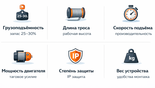 Запас по нагрузке особенно важен — производители прямо рекомендуют использовать лебёдки с резервом мощности не менее 30%.